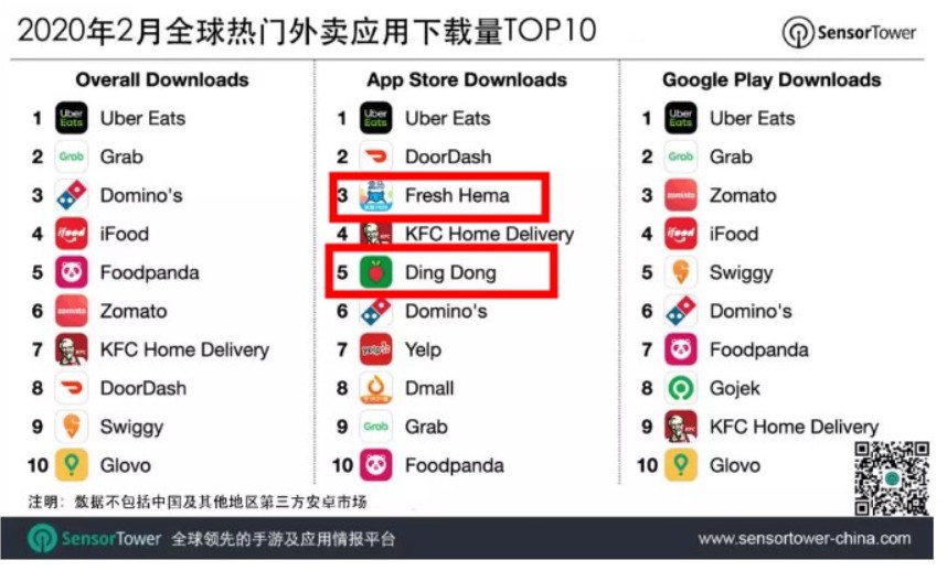 而疫情加速了互联网企业的反击速度。因为疫情凸显出带有配送服务平台的优势,尤其是盒马鲜生、叮咚卖菜等电商平台的表现更是瞩目。据Sensor Tower 商店情报数据显示,2月盒马鲜生和叮咚买菜分列全球iOS外卖应用下载榜第3和第5名。