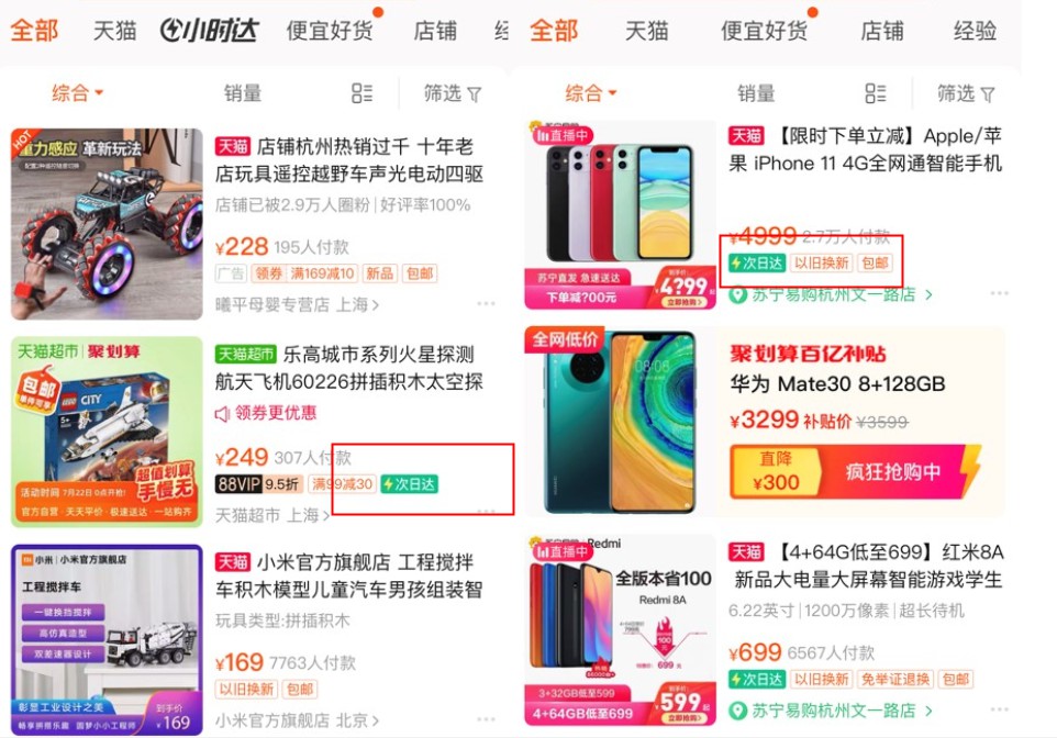 这是什么意思呢?不是说阿里突然要求商家必须要当日达、次日达,而是其通过大数据对全部实体品类进行时效考核,筛选出具备稳定性时效的商品,然后给他们分别贴上显现当日达、次日达、隔日达等绿色标签。