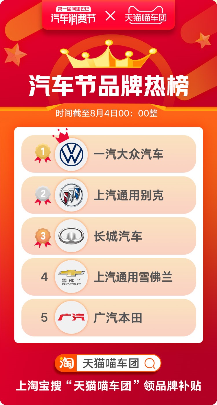 天猫数据显示,截止8月4日,近200万人次涌入天猫抢车,一汽大众、上汽通用别克、长城汽车、上汽通用雪佛兰、广汽本田成为汽车节第一周最受消费者欢迎的Top5品牌。