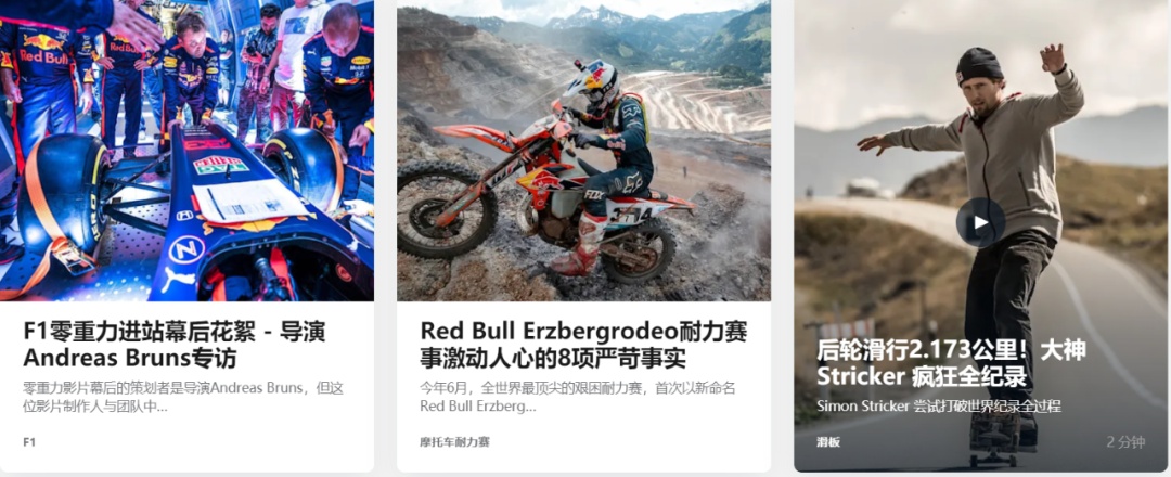 如今打开奥地利红牛的官网,你会发现画面里全是各种极限运动,一级方程式赛车、山地自行车、摩托车越野赛、翼装飞行、跑酷...就是看不到饮料...想了解饮料,上官网还不如上百度百科。