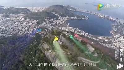 在奥运开幕前,红牛组织了5名翼装飞行员从高空俯冲而下,他们分别穿着蓝、黄、黑、绿、红颜色的飞行服,排列成与奥运五环颜色相同的顺序,从里约热内卢的大基督像前飞过。