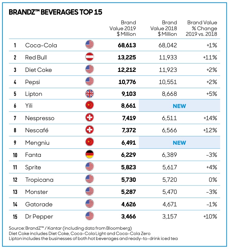 有媒体统计,过去15年,有超过100家竞争对手试图动摇红牛地位,包括可口可乐和安海斯·布希,却都纷纷败下阵来。在《2019全球最具价值的百大品牌》报告中,奥地利红牛在饮料类榜单中甚至高居第二。