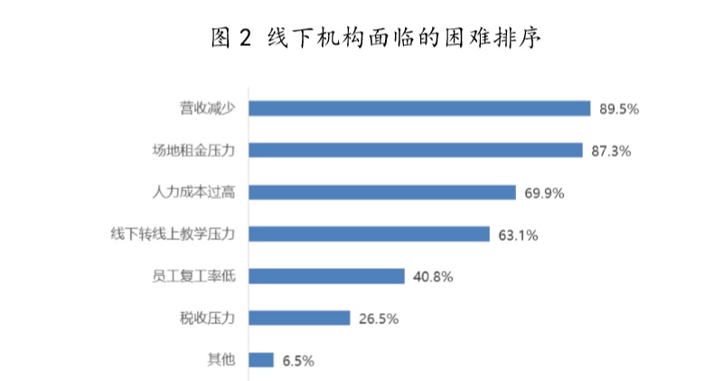当然,线上线下融合的机构也同样面临场地租金压力、营收减少、人力成本过高等难题。其三,当下有部分机构此前依赖金融贷款而不断进行规模扩张,因疫情影响营收导致还款能力下降,给资金链带来更大的压力与问题。根据该报告指出,线下机构中有49.42%的机构预计收入同比减少50%以上。