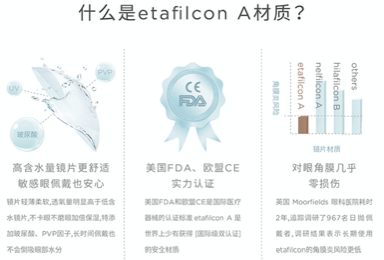 MOODY一直以来非常重视产品和研发方面的投入。在前期历时12个月,试遍市面上百余种隐形眼镜之后,最终决定以极高成本坚持使用强生同款顶尖材质——etafilcon A。作为全球少有同时获得美国FDA和欧盟CE双重认证的的安全材质,etafilcon A在英国Moorfields眼科医院历时2年、追踪967名日抛镜片佩戴者的临床研究中,被证明长期使用后发生角膜浸润的风险显著低于其他材质。使用etafilcon A的镜片十分轻薄柔软,不仅对角膜接近零损伤,而且是敏感眼专用材质。