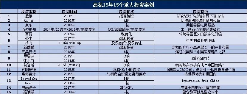回顾高瓴创立以来的15个重大投资,管窥其庞大的跨产业版图,就会清晰地发现,高瓴自觉嵌入了中国过去15年经济产业的历次主题跃迁:既押注于移动互联网、电商、医疗健康等创新行业,又深度参与了中国传统消费及制造业产业升级。