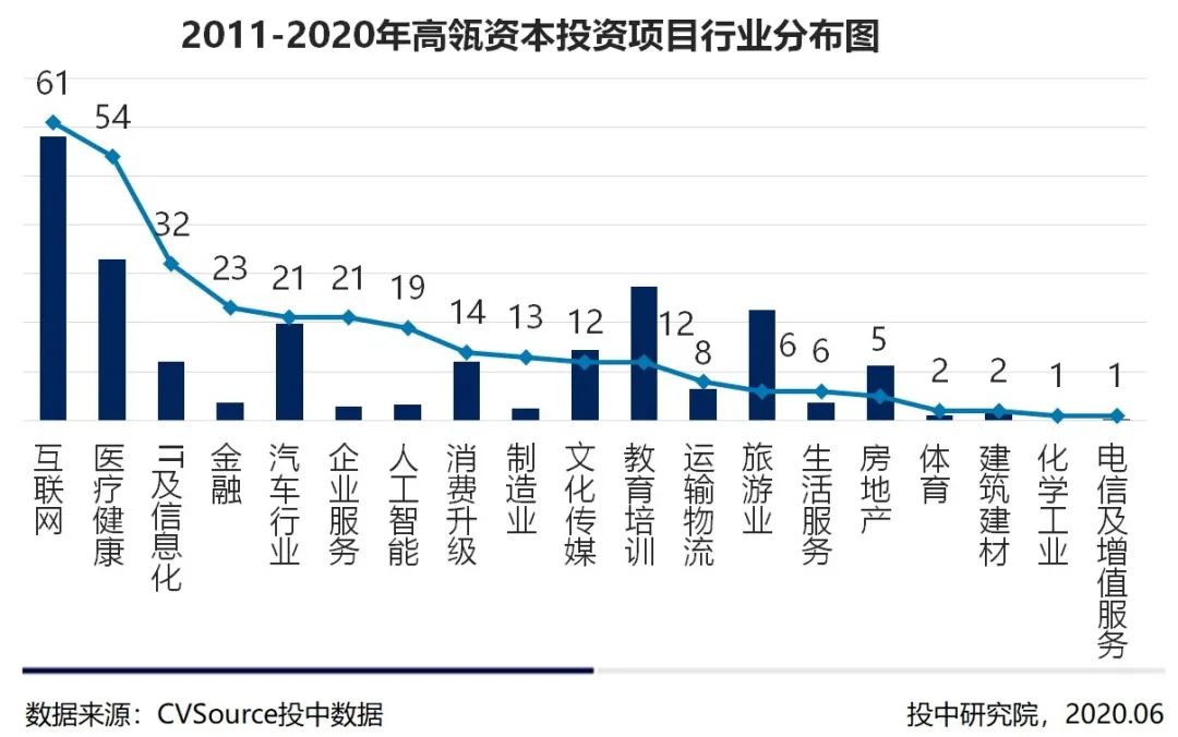 更直观来看,仅从2011年以来的10余年的时间里,高瓴涉足了19个行业,共计300多次的投资,对于互联网、医疗健康、IT及信息化三大行业更是青睐有加,达到了61、54、32个项目,且都投到了头部企业。