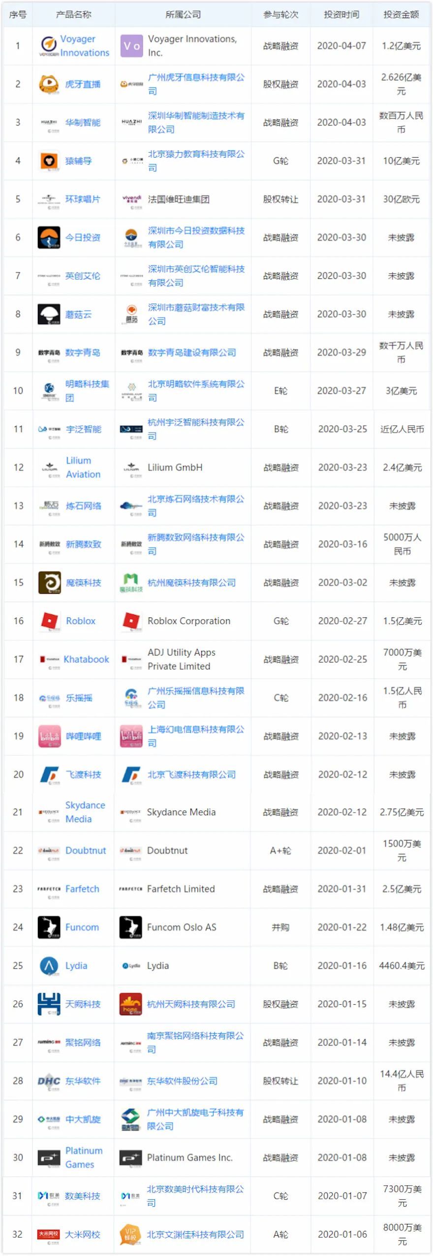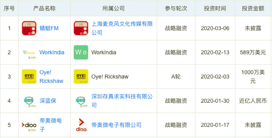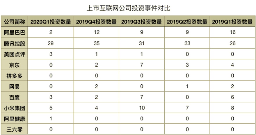此外,美团点评、百度各投资3家,并列第三,且环比2019年第四季度均有增加: