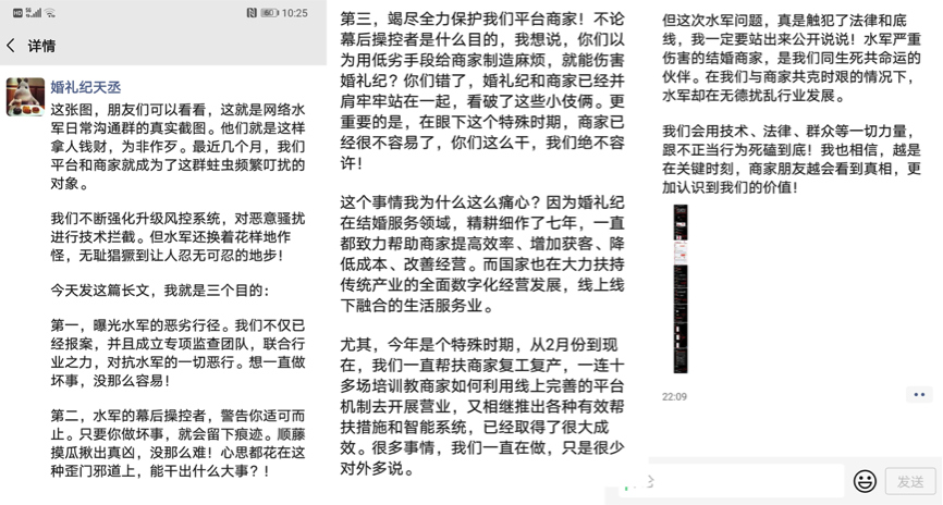 为此,婚礼纪发布声明,称针对水军恶劣行径,将不断升级风控系统,对恶意骚扰进行技术拦截。同时,公司正式向社会各界悬赏征集有效证据,深挖幕后操控组织的真实目的,打击任何不正当竞争。一经核实,依据线索价值,提供1000元到100万不等的奖励。