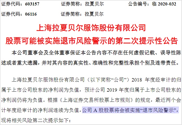 3月23日,拉夏贝尔发布公告称:其A股股票可能在发布2019年财报之后,被上交所实施退市风险警示。