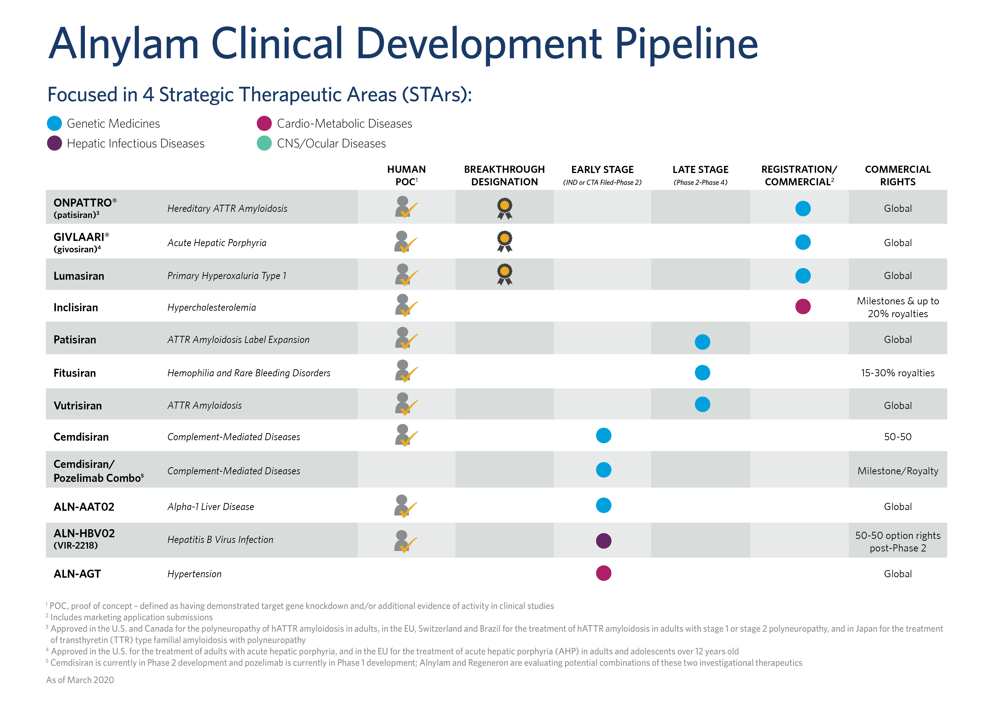 Alnylam(Nasdaq: ALNY)正在引领RNA干扰(RNAi)的翻译为一类全新的创新药物,具有改变遗传,心脏代谢,肝感染和中枢神经系统罕见患者的生活的潜力( CNS)/眼部疾病。基于诺贝尔奖获得者的科学,RNAi疗法代表了一种强大的,经过临床验证的方法,可用于治疗各种严重且令人衰弱的疾病。 Alnylam成立于2002年,致力于通过强大的RNAi治疗平台实现将科学可能性变为现实的大胆愿景。 Alnylam的商业RNAi治疗产品是在美国,欧盟,加拿大,日本和瑞士获得批准的ONPATTRO?(patisiran),以及在美国和欧盟获得批准的GIVLAARI?(givosiran)。 Alnylam拥有大量的研究药物,其中包括处于后期开发阶段的六种候选产品。 Alnylam正在执行其“ Alnylam 2020”战略,该战略将建立一个多产品,商业阶段的生物制药公司,该公司具有基于RNAi的药物的可持续生产渠道,以满足治疗方案有限或不足的患者的需求。