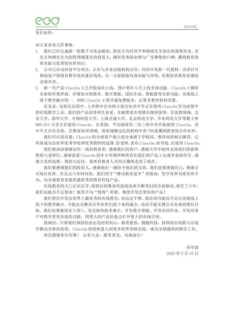 以下,为翼鸥教育创始人兼CEO宋军波内部信。