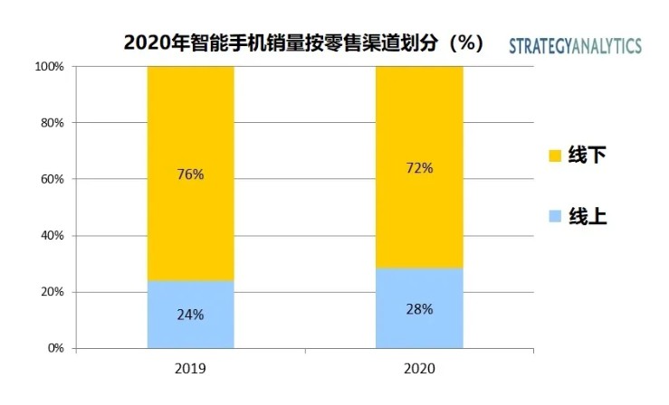 7月20日消息,《电商报》获悉,市场调研机构Strategy Analytics最新发布的研究报告指出,2020年,智能手机在线零售渠道销量在全球智能手机总销量中的占比将达到28%,创历史记录,而这一数字在2019年为24%。