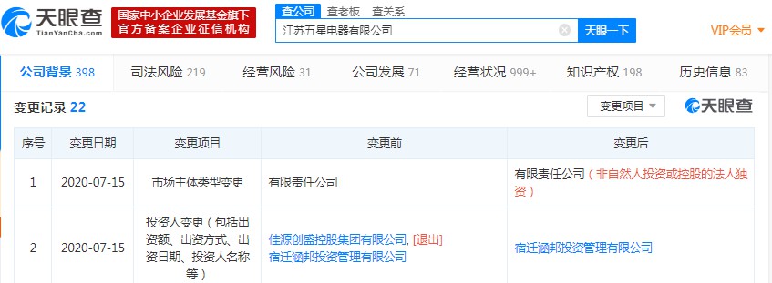 7月20日消息,天眼查数据显示,近日,江苏五星电器有限公司发生工商变更,佳源创盛控股集团有限公司退出股东行列。