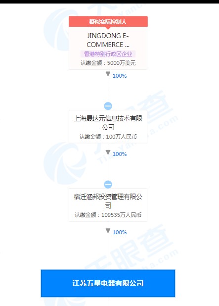 天眼查资料显示,宿迁涵邦投资管理有限公司成立于2016年1月,由于上海晟达元信息技术有限公司100%持股。后者为Jingdong E-COMMERCE(TRADE)HONG KONG CORPORATION LIMITED的全资子公司。