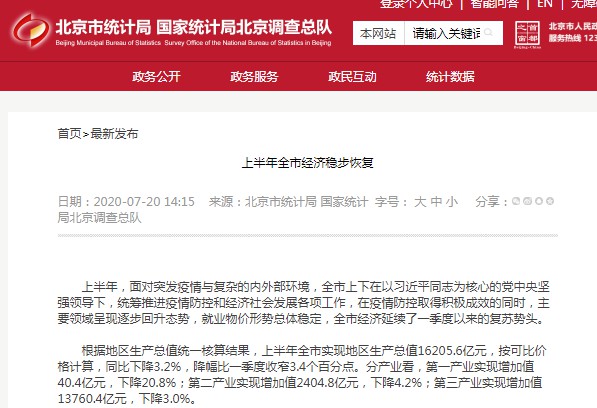 7月20日消息,今日,北京市统计局、国家统计局北京调查总队发布上半年全市经济运行情况。
