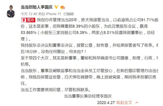 2020年4月26日,已经失去当当网控制权2年之久的李国庆,突然间再次出现在当当网的办公区,而且还带着“四名壮汉”,公然拿走了当当网的几十枚公章及财务章。