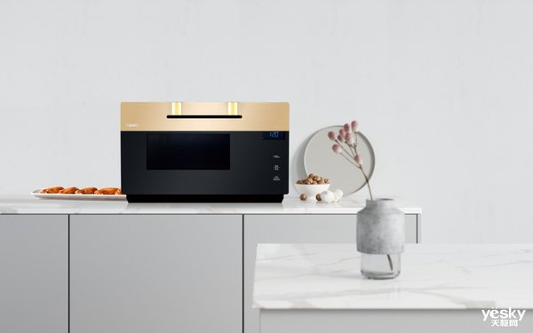 它颜值超高,机身只保留了显示烹饪时间、火力等信息的液晶显示屏和三个最基本的操作按键。其他功能菜单键全部采取了隐藏式设计,只有在下拉门打开后,才能看到炉腔右边的功能组。如此设计,使得整体感更强,设计感更强。