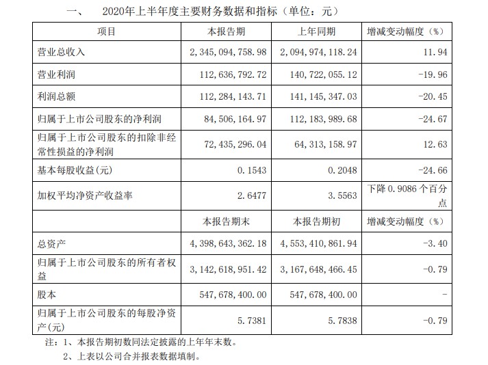 2020上半年度,公司实现营业收入23.45亿元,同比增长11.94%,其中,主营业务收入22.60亿元,同比增长13.21%;归属于上市公司股东净利润8,451万元,同比下降24.67%;归属于上市公司股东的扣除非经常性损益的净利润7,244万元,同比上升12.63%。