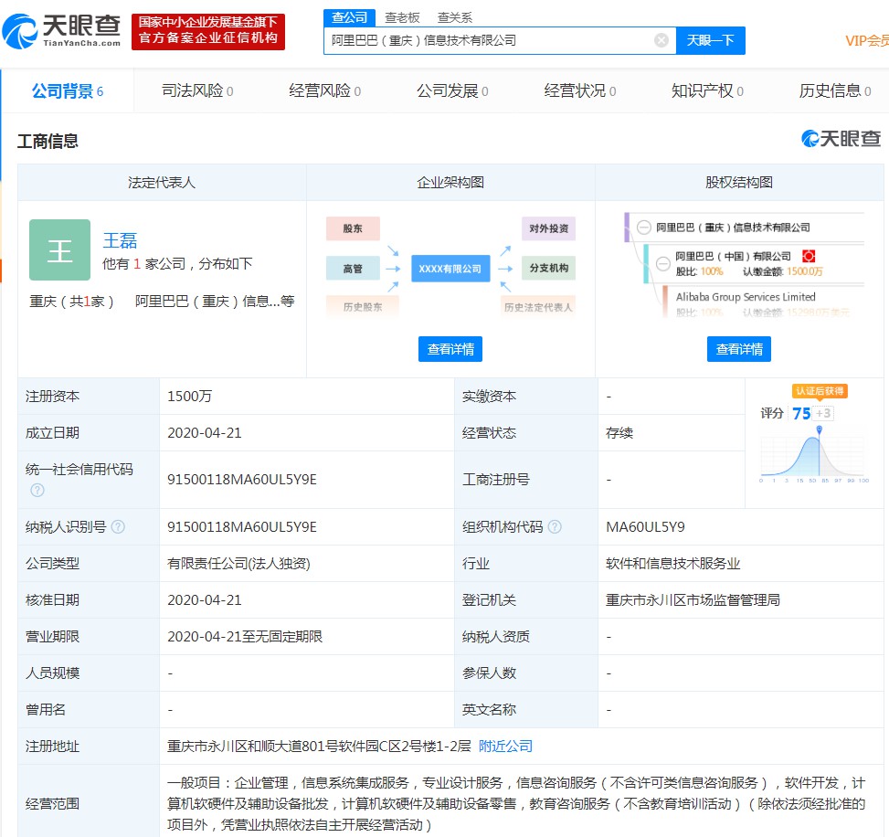 据了解,今年4月,阿里巴巴(中国)有限公司还在重庆全资成立了一家信息技术新公司。天眼查数据显示,4月21日,阿里巴巴(重庆)信息技术有限公司成立,注册资本为1500万,法定代表人为王磊。公司经营范围包括软件开发,计算机软硬件及辅助设备批发,计算机软硬件及辅助设备零售等。