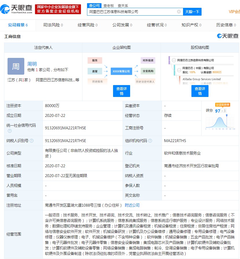 7月23日消息,《电商报》获悉,天眼查数据显示,7月22日,阿里巴巴江苏信息科技有限公司成立,注册资本为8亿,法定代表人为周明。