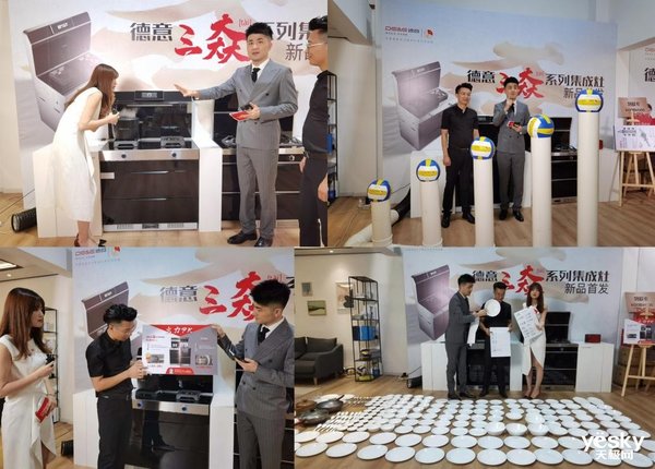 另一现场则带领大家见证了三大性能测评实验:利用绕了多道弯、且有5路分支结构的排风管发起吹重物挑战,每个出风口都能吹起一个排球并长时间悬浮于空中,验证了这款集成灶的超大风压;加热5加仑的水,同环境下德意三?集成灶较市场上常规4.0kW火力的产品,用时快了7分钟43秒,火力强度可见一斑;将搁置于消毒柜中的餐具逐一取出,平铺在地,经计算发现可容纳248件餐具,足以看出这款集成灶的存储空间之大。