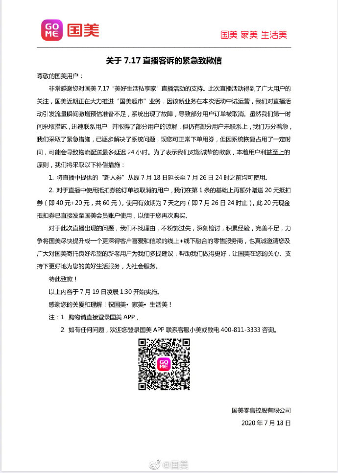 但步子迈太大也很危险,就在央视新闻&国美零售战略签约发布会的前5天,即7月17日,国美与央视的直播刚刚经历了一场翻车;上个月国美还因在直播带货中侵犯了消费者权益被中消协直接点名。
