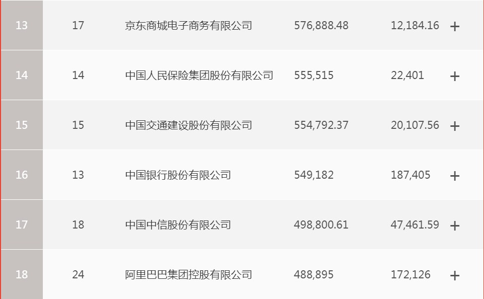 榜单数据显示,京东商城电子商务有限公司由去年的第17名升至第13名,在电商领域位列第一。阿里巴巴集团控股有限公司则从去年的第24名升至第18名。