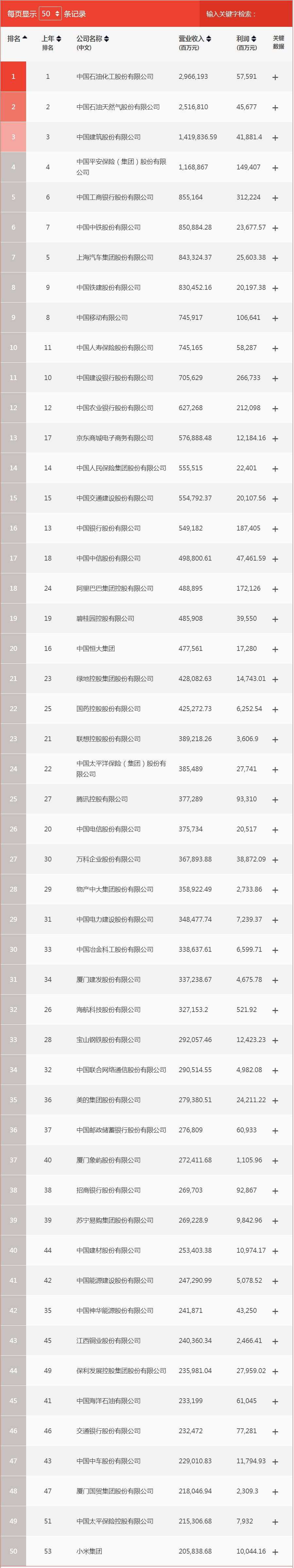 值得注意的是,在本次榜单中,苏宁易购集团股份有限公司与去年一样位列第39名,腾讯控股有限公司则由去年的第27名升至今年的第25名,小米集团由去年的53名上升至第50名,首次跻身50强,网易公司由去年的第135名滑落至179名。