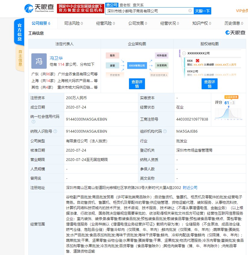 7月27日消息,《电商报》获悉,天眼查数据显示,近日,深圳市钱小鲜电子商务有限公司成立,注册资本200万人民币,法定代表人为冯卫华,公司经营范围包括谷物副产品批发;商品批发贸易(许可审批类商品除外);自动售货机、售票机、柜员机及零配件的零售等。该公司由广州市钱大妈农产品有限公司全资持股。