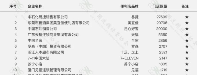 截至2020年6月30日,中石化旗下便利店品牌易捷以27699的门店数量排名第一,美宜佳超越中石油排名第二,全家以2856家排名第五,罗森和7-11以2707家和2147家分列第六和第八,苏宁小店以1835家位居第九。