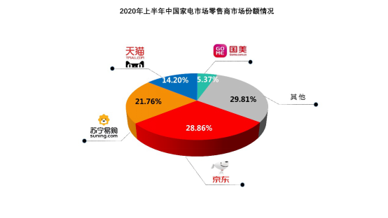 作为受疫情冲击明显的实体行业之一,家电消费在今年上半年经历了阵痛期后,如今已复苏至去年同期水平。7月27日,中国电子信息产业发展研究院最新发布的《2020上半年中国家电市场报告》(以下简称《报告》)中指出,疫情促使各行业加速向线上转移,互联网零售渠道对家电市场的快速复苏起到了关键作用。其中,在3C家电领域经营多年、刚获得2020年《财富》中国500强排名“互联网服务与零售”企业第一的京东为家电行业创造了巨大的增长动能,也因此成为上半年家电市场全渠道份额第一的平台,占比达到28.86%,大幅领先其他家电零售商。
