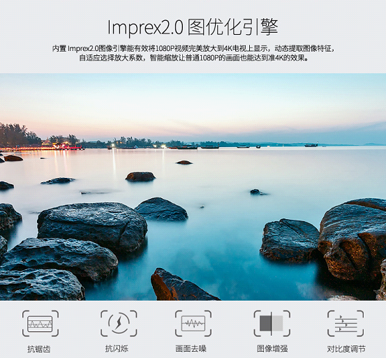 除了画质上的强大提升外,HD930B在硬件上也全面升级,不但采用了海思Hi3798CV200芯片方案,内存容量上也扩大2GB+16GB超大豪华配置。HD930B采用的海思芯片方案率先支持4KHDR高动态范围技术,内置Imprex2.0图像引擎能有效将1080P视频完美放大到4K电视上显示,动态提取图像特征,自适应选择放大系数,智能缩放让普通1080P的画面也能达到准4K的效果。