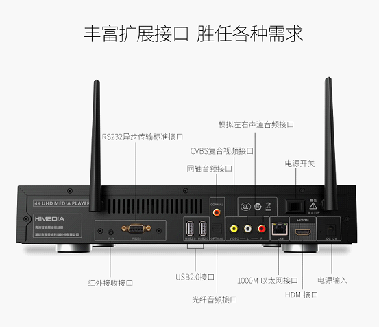 并配置了SATA3.0+、USB3.0、1000M以太网、蓝牙5.0、双频WIFI等强大接口,千兆网络接口保证了观看超大高码率视频清晰流畅、快速载入蓝光原盘文件;USB3.0接口提高了传输速率以及保证了传输的稳定性;通过蓝牙5.0可以外接各种音响、蓝牙耳机、游戏手柄等无线设备;双频WIFI保证了无线网络的传输速率,内置硬盘仓,可支持14T大硬盘;如此齐全的接口配置全部集齐于HD930B这款播放器身上。