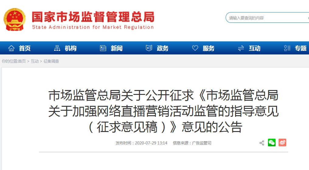 7月29日消息,《电商报》获悉,市场监管总局今日发布公告,为加强网络直播营销活动监管,促进直播营销新业态健康发展,依据相关法律规定,市场监管总局起草了《市场监管总局关于加强网络直播营销活动监管的指导意见(征求意见稿)》(以下简称指导意见),现向社会公开征求意见。