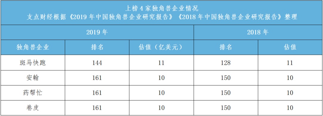 与上一年相比,上榜的4家独角兽企业估值没有变化。除斑马快跑估值11亿美元外,其余3家独角兽企业的估值均为10亿美元。