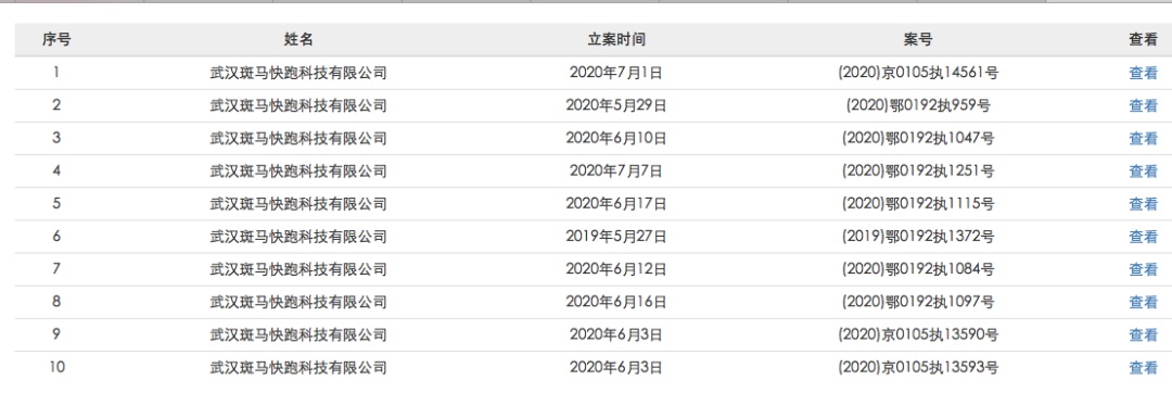 此外,支点财经查询中国执行信息公开网发现,2018年11月15日至今年7月13日,涉及斑马快跑及其分公司的被执行信息高达53条,涉及执行标的达数百万元。
