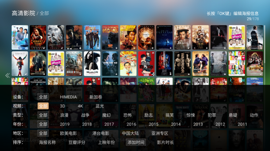 像这款海美迪Q5plus在本地播放上面可以将USB、SATA硬盘直接插入后面的接口,高清影院界面就会自动实现本地影片海报墙展示、海报墙上标示了影片4K/3D/剧集等图标,分类明确。点击某个具体影片,还有该片豆瓣评分、影片详情介绍、音视频格式等介绍,并且可以进行一键播放/续播和收藏,非常的美观大气。