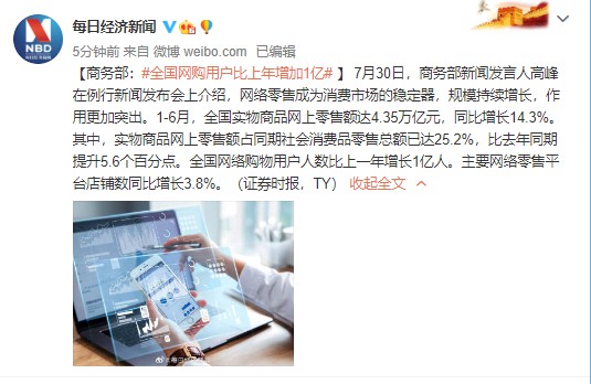 7月30日消息,商务部新闻发言人高峰在例行新闻发布会上介绍,网络零售成为消费市场的稳定器,规模持续增长,作用更加突出。1-6月,全国实物商品网上零售额达4.35万亿元,同比增长14.3%。
