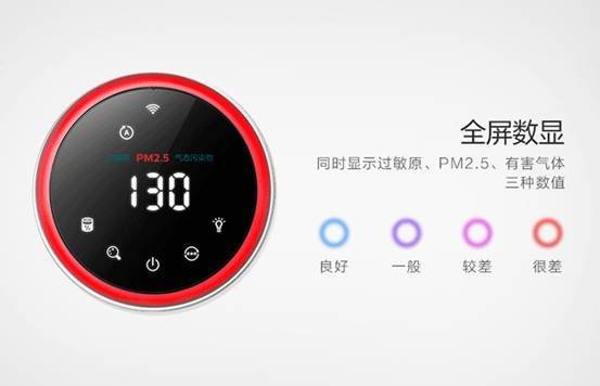 搭载飞利浦AeraSense灵智感应技术,可实时监测并显示PM2.5/有害气体/过敏原三种室内空气质量状况,面板数值配合四种灯光颜色指示空气状况等级,直观而自然。产品每0.1秒还会检测一次空气质量,并根据室内空气环境自动调整净化模式,