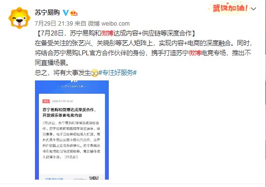 而在苏宁易购与微博的合作协议中也提到,基于苏宁易购在3C品类上的优势,以及LPL官方合作伙伴的身份,将携手打造苏宁微博电竞专场,推出不同的直播场景。