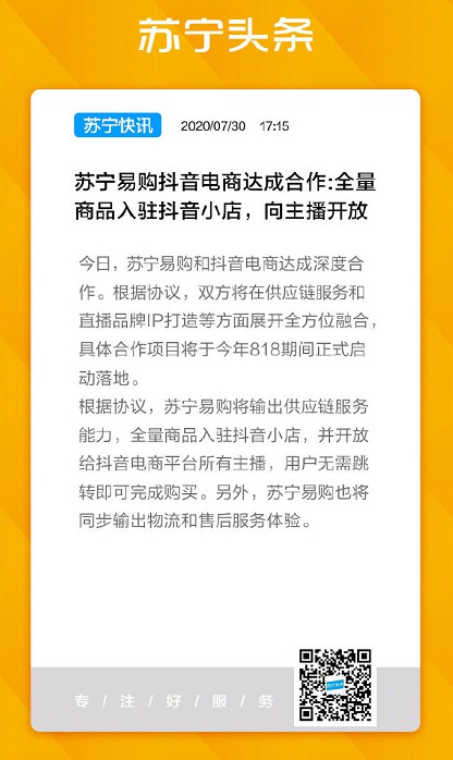 根据协议,苏宁易购将输出深耕30年的供应链服务能力,全量商品入驻抖音小店,并开放给抖音电商平台所有主播,用户无需跳转即可完成购买。在苏宁正品优品保障的前提下,苏宁易购也同步输出物流和售后服务体验。