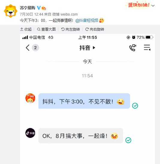 《电商报》注意到,昨日中午,苏宁易购在其官方微博上晒出了和抖音的简短对话截图,还提到“8月搞大事,一起燥”。寥寥数语,释放出非比寻常的信号。