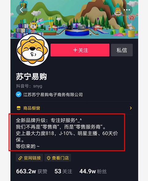 另外,苏宁易购在抖音官方账号上的介绍已经变成了:“史上最大力度818,J-10%、明星主播、60天价保。”