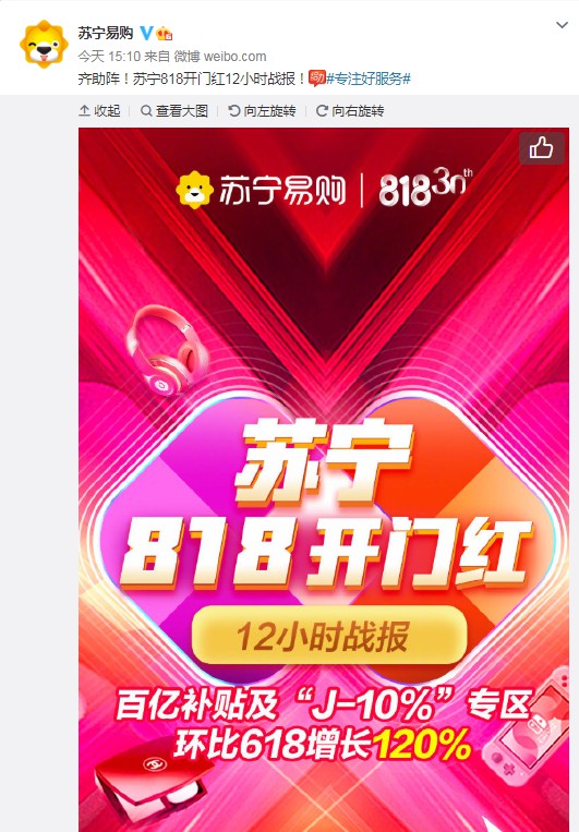 7月31日消息,苏宁易购818开门红12小时战报显示,苏宁易购818开启12小时,百亿补贴及“J-10%”专区商品销售环比618开门红增长120%。