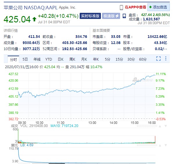 8月1日消息,在美股周五交易中,科技龙头股多数上涨。其中,苹果公司股价收盘涨幅达10.47%,报425.04美元,创下收盘纪录新高,总市值达到1.84万亿美元,超越沙特阿美6.59万亿沙特里亚尔(约合1.76万亿美元)的总市值,重回全球市值最大公司宝座。