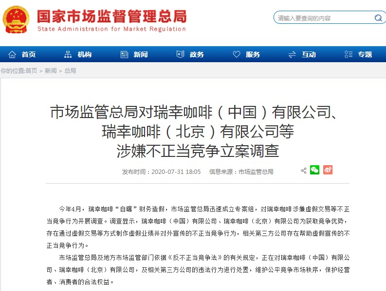 据了解,7月31日,国家市场监管总局网站发布消息称,今年4月,瑞幸咖啡“自曝”财务造假,市场监管总局迅速成立专案组,对瑞幸咖啡涉嫌虚假交易等不正当竞争行为开展调查。调查显示,瑞幸咖啡(中国)有限公司、瑞幸咖啡(北京)有限公司为获取竞争优势,存在通过虚假交易等方式制作虚假业绩并对外宣传的不正当竞争行为,相关第三方公司存在帮助虚假宣传的不正当竞争行为。