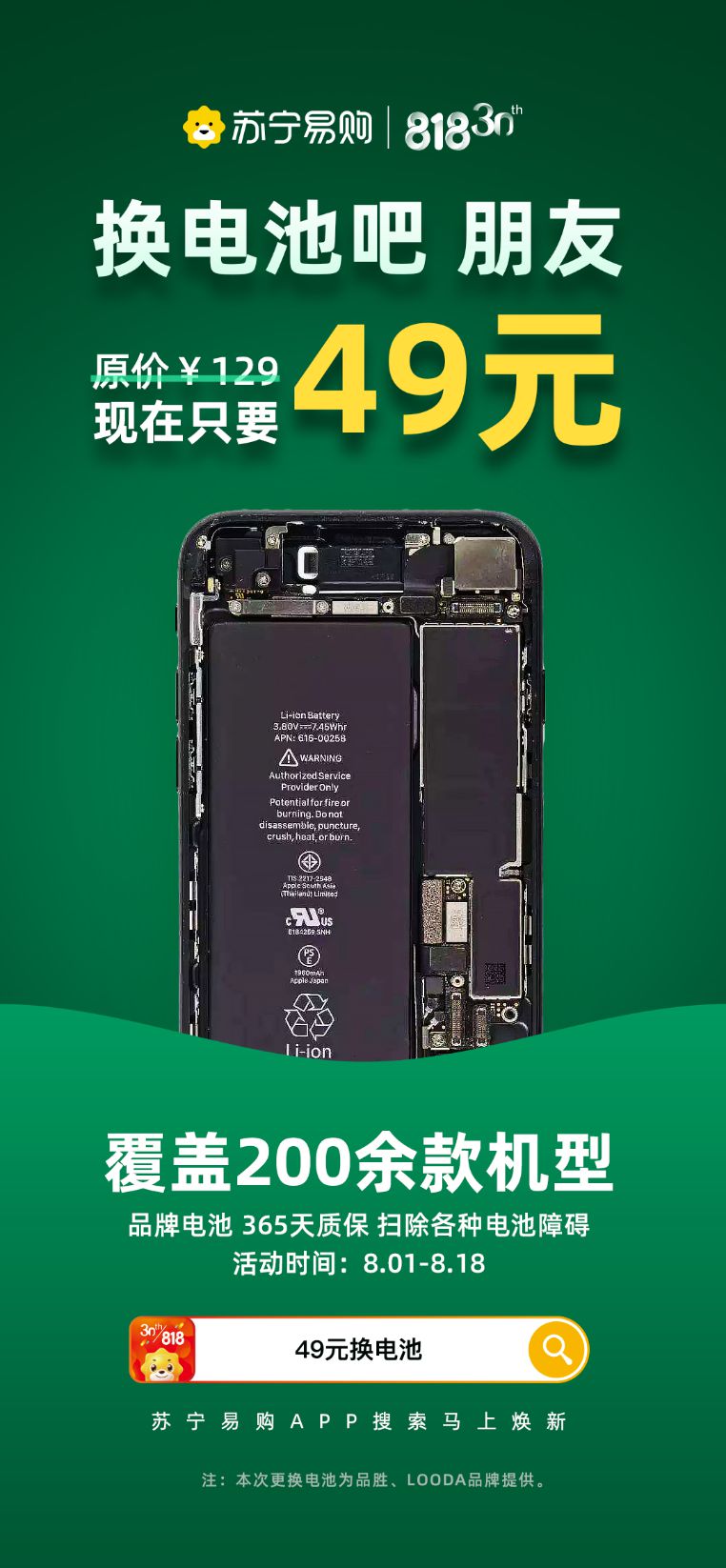 8月3日消息,《电商报》获悉,继7月31日苏宁818开门红后,苏宁手机百亿补贴服务再升级,特别推出49元换手机电池活动,8月1日至8月18日,覆盖苹果、华为、小米等200余款机型,365天质保无忧。