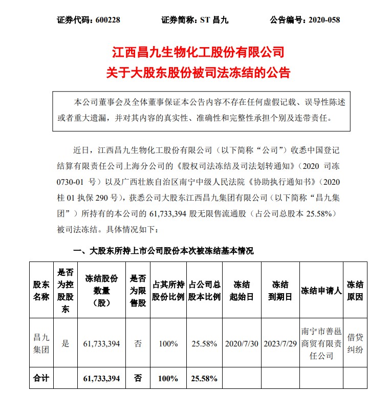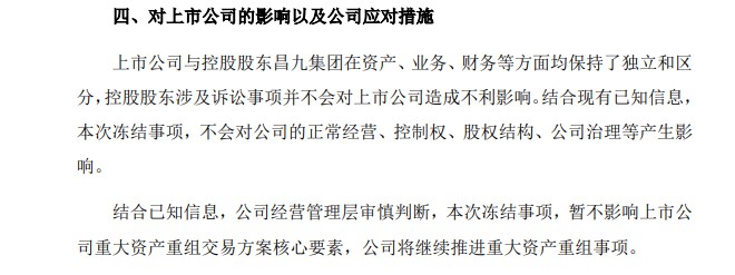 对于此次股份冻结事项,昌九集团已与南宁善邕进行了沟通,南宁善邕8月2日向昌九集团出具书面函件,同意就该事项调整更换冻结资产,具体方案由双方协商确定。但截至目前,本次股份冻结的解除冻结手续尚未实施。