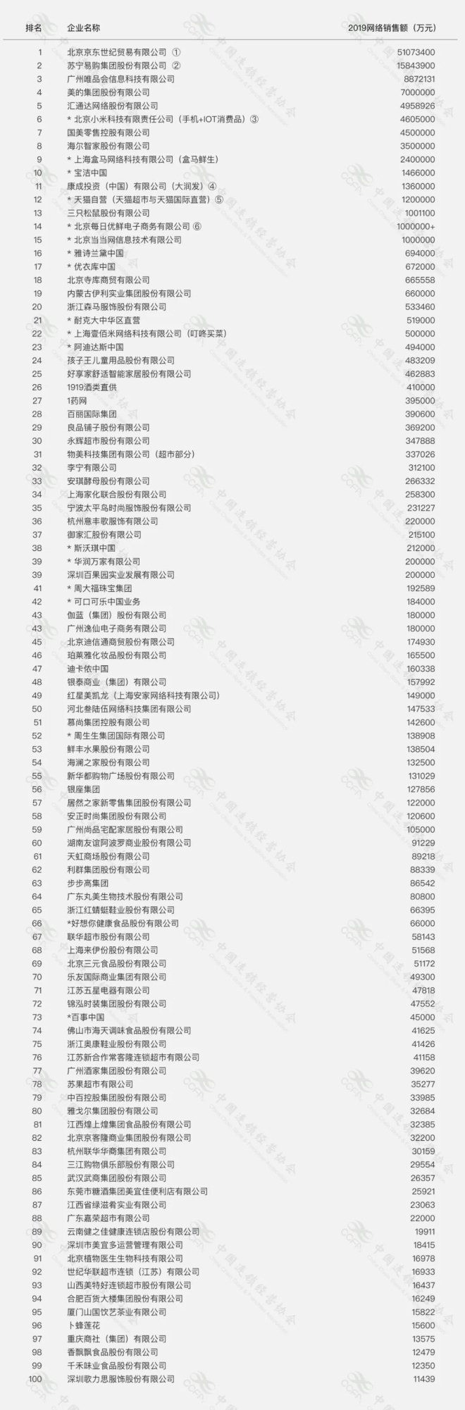 资料显示,2020中国网络销售TOP100榜单由中国连锁经营协会与德勤共同调研制定,排名以2019财年网络销售额为主要依据,数据来自中国连锁经营协会问卷调查、公司公开信息、上市公司财报、新闻稿等材料以及行业分析报告、交易记录估算,新闻访谈等。