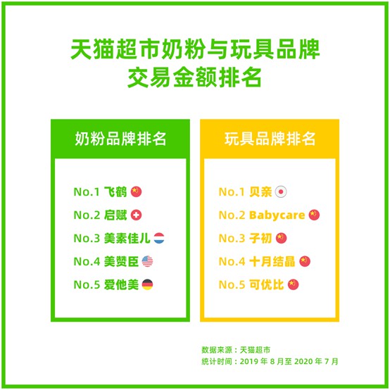 此外,从母婴消费品牌来看,在奶粉品牌中,国产品牌飞鹤交易金额超过启赋、美素佳儿等欧美品牌,位列第一。在玩具用品方面,国产品牌更是占据了交易金额前5名中的4个席位。由此可见,当下的年轻父母更倾向于购买国产品牌的母婴用品。